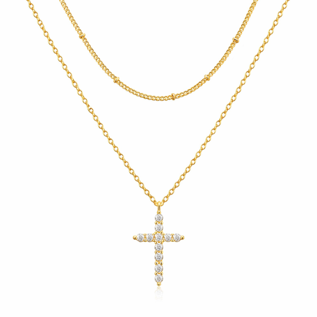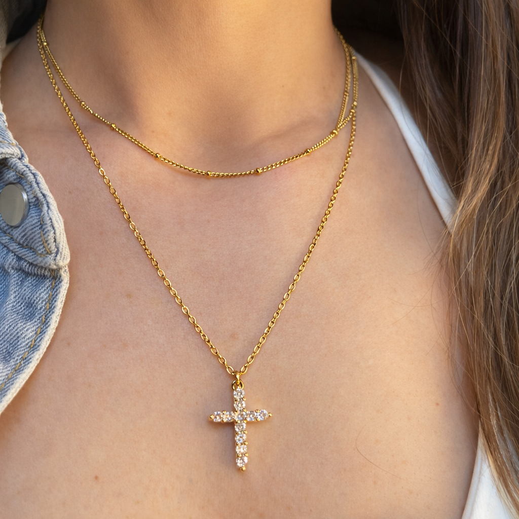 Die Layer-Halskette mit Kreuz ist das perfekte Accessoire für alle, die auf der Suche nach einem modernen und spirituellen Schmuckstück sind! Diese Kette kombiniert mehrere Lagen, die sich harmonisch um deinen Hals legen und mit einem eleganten Kreuzanhänger abschließen. Der Kreuzanhänger verleiht deinem Look eine tiefere Bedeutung und passt sowohl zu lässigen Outfits als auch zu eleganteren Anlässen.