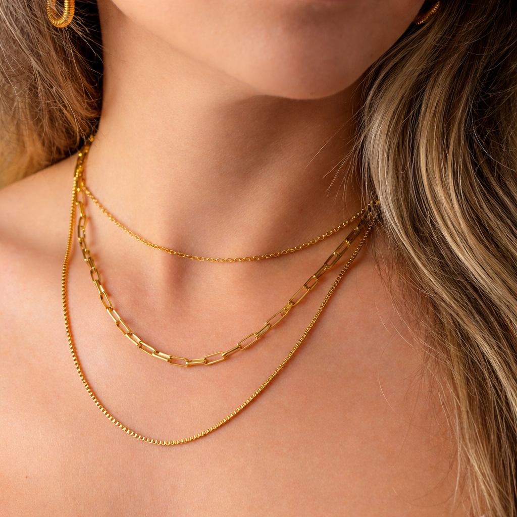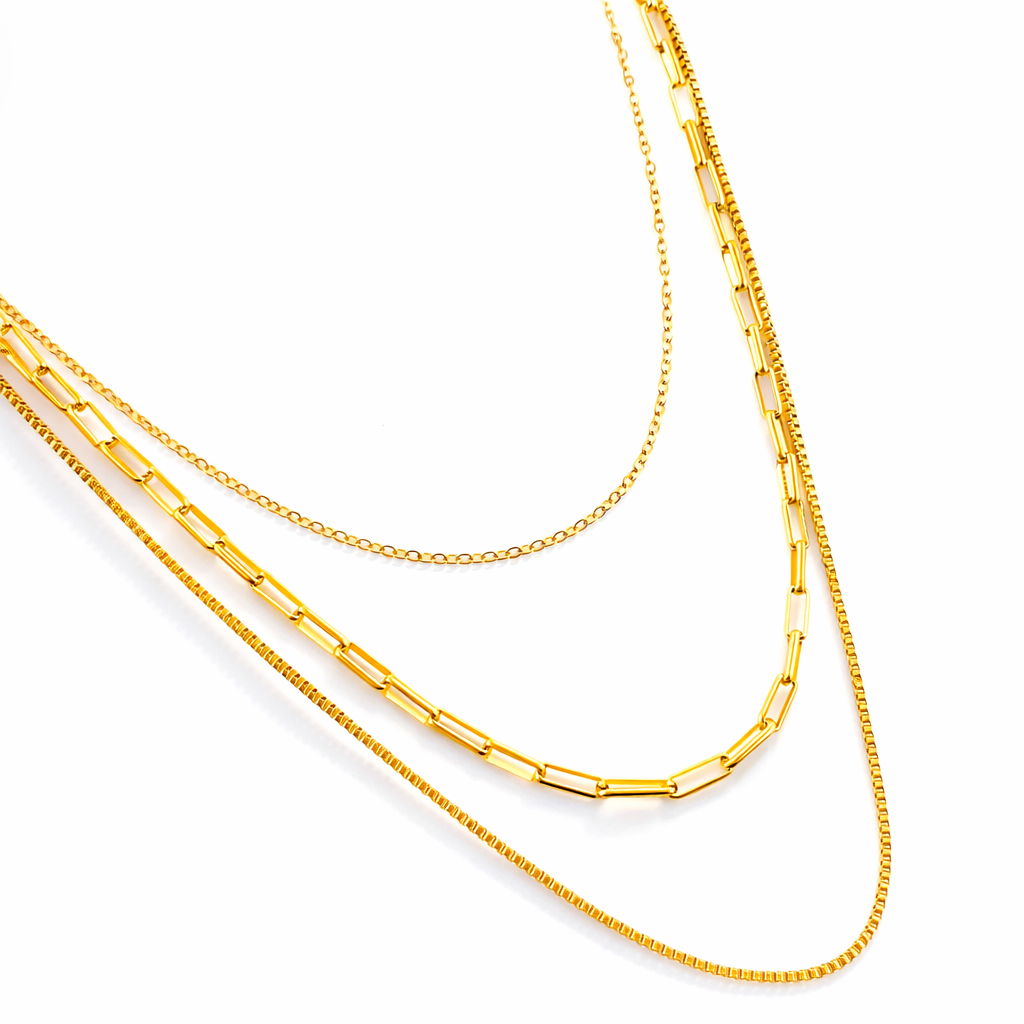 Dieses Mehrschichtige Gliederkette vereint drei fest verbundene Ketten in einem einzigartigen Design. Die Lagen sind perfekt aufeinander abgestimmt und sorgen für einen modernen, stilvollen Layering-Look – ganz ohne Aufwand.